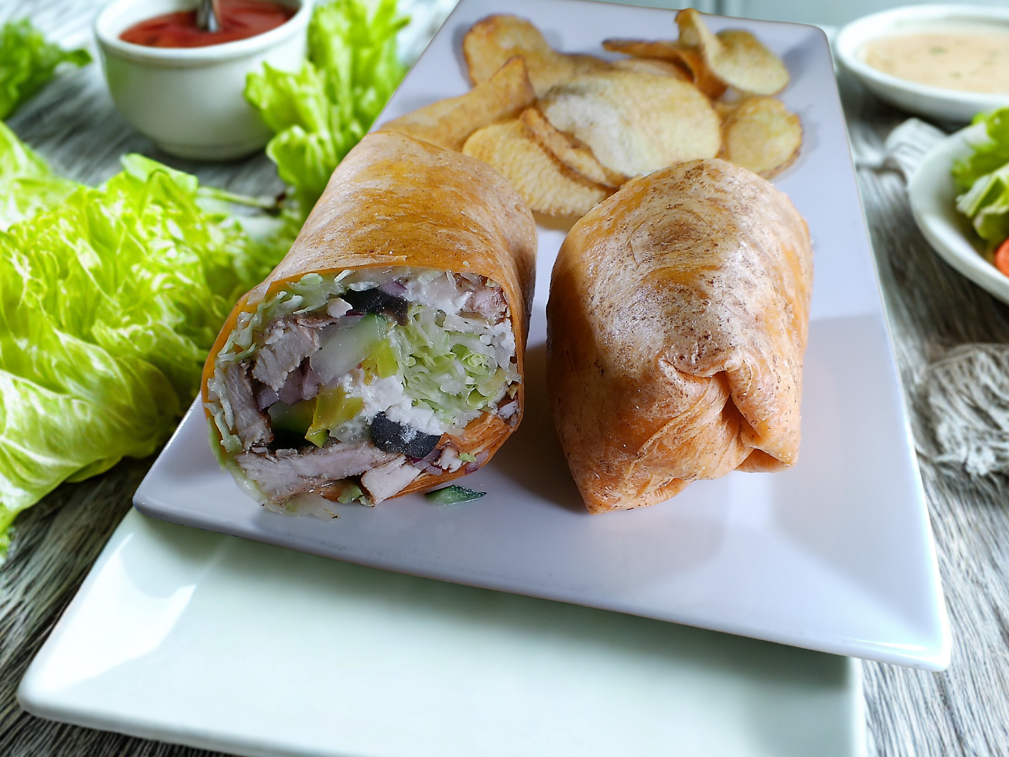 Sliced marinated grilled chicken breast, feta, lettuce, black olives, red onions, cucumbers, fresh tomatoes, hot peppers and Greek dressing. Wrap Choice: Tomato & Basil , Spinach, Wheat and White.